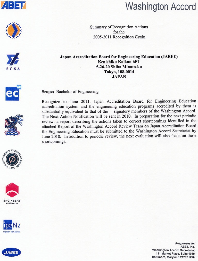 認証期間は2011年までとします。JABEEの認定制度とJABEEにより認定された技術者教育プログラムはワシントン協定加盟国の認定システムおよび技術者教育プログラムと実質的に同等であると見なします。