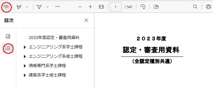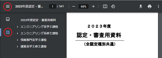 ブラウザでファイル表示される際も、PDFのしおり機能をご活用いただけます。以下の赤で示した箇所をクリックして表示してください。