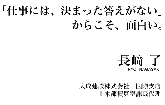 「高校時代は全然勉強していなくて、大学は必修科目をとらなければならないお蔭で勉強できました」と飾らず笑い、「仕事は、やればやるほど面白くて」と目を輝かせる長﨑さん。土木の現場に魅せられ、大きなプロジェクトのマネジメントも経験し、海外に羽ばたく夢に着実に歩みを進める長﨑さんは、チームであたる仕事の面白さ、厳しさ、やりがいを日々実感しています。