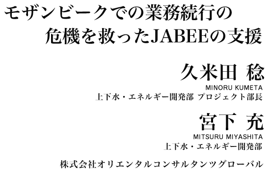 「国際認定された教育を受けた技術者がいなければ、業務実行は認められません」。モザンビークですでに火力発電所の工事監理業務にあたっていたエンジニア3名は、認定教育を受けていませんでした。オリエンタルコンサルタンツグローバルの久米田さんは祈るような気持で2018年3月、現地からJABEEに連絡を入れたそうです。その経緯から、学ぶこととは。オリエンタルコンサルタンツグローバル上下水・エネルギー開発部の久米田氏、宮下氏にお話を伺いました。