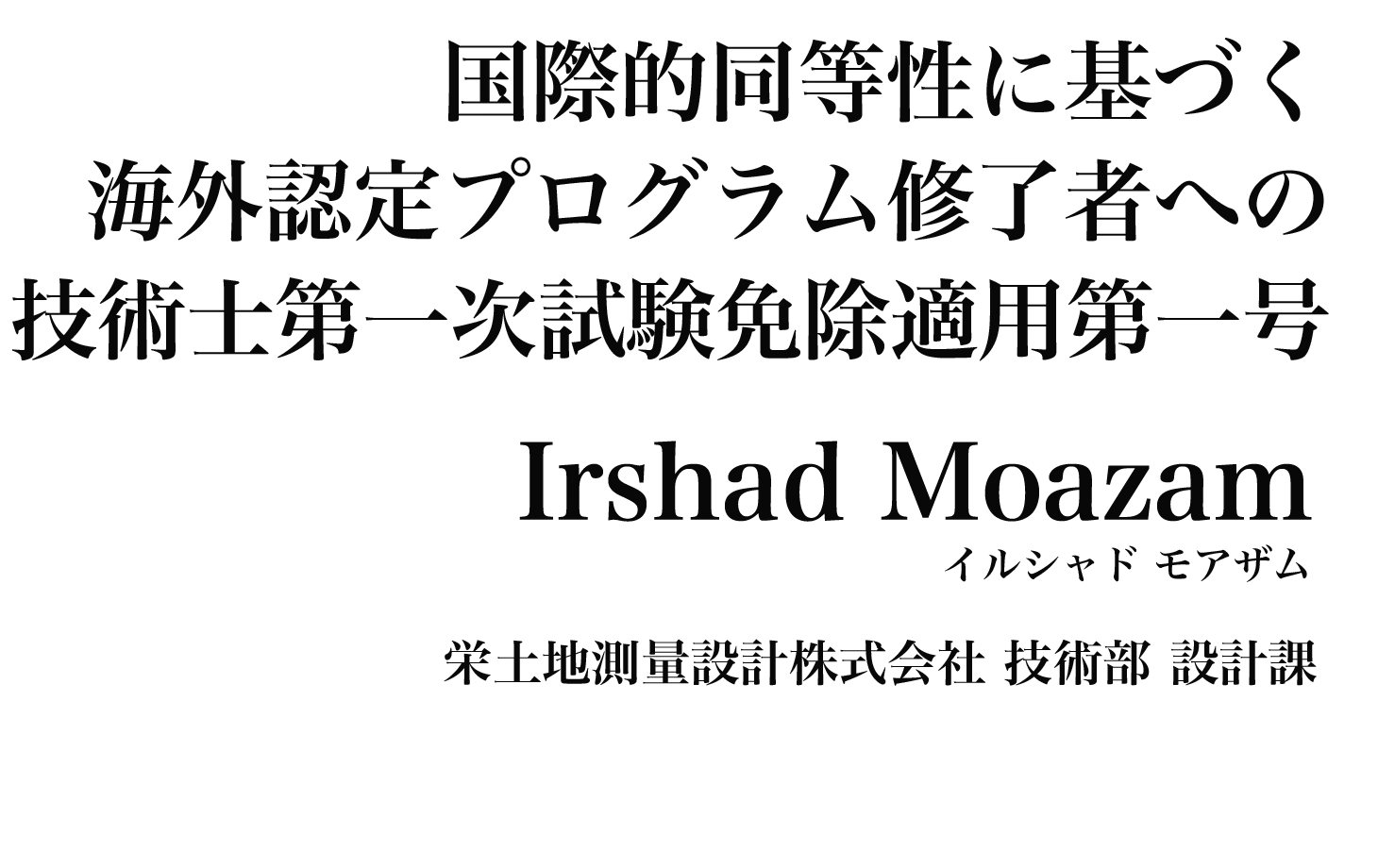 今回、その第一号申請者として第一次試験が免除されたのが、パキスタン出身で現在は愛知県豊橋市の「栄土地測量設計」に勤務するモアザムさんです。 その軌跡と想いを伺いました。