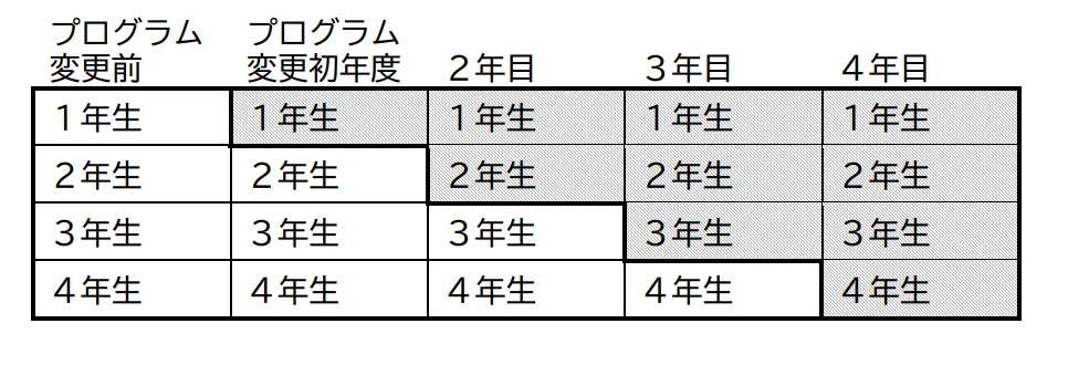 • 認定プログラムの教育内容、名称などを変更する場合には、原則的には下の図にあるように変更の初年度に入学した学生から適用し、変更前に入学した学生は(修学延長生を含めて)卒業まで変更前のプログラムで教育することを前提としています。