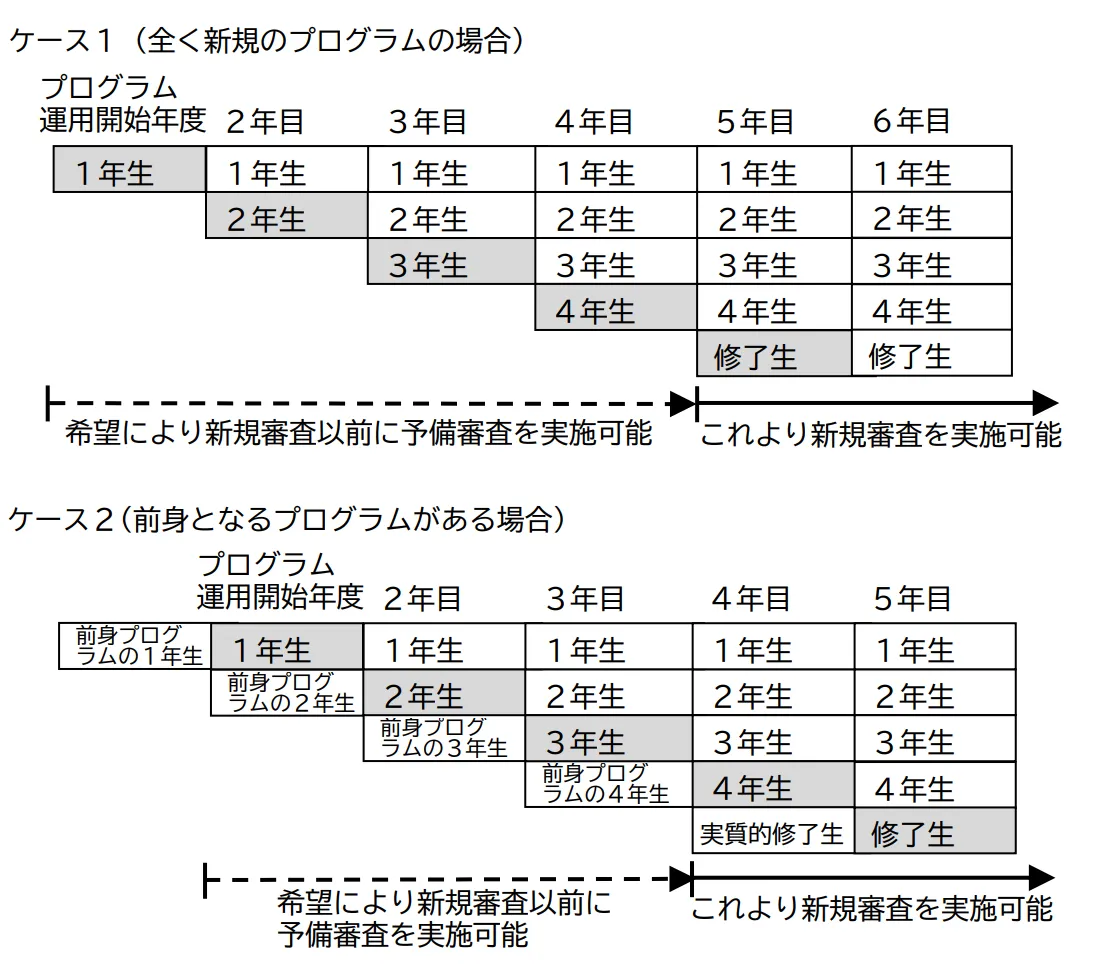 - 全く新規ではなく前身となるプログラムがあり、審査の前年度にそのプログラムを修了した「実質的修了生(注)」が存在する場合には、4年目に新規審査を受けることが可能です。(ケース2)