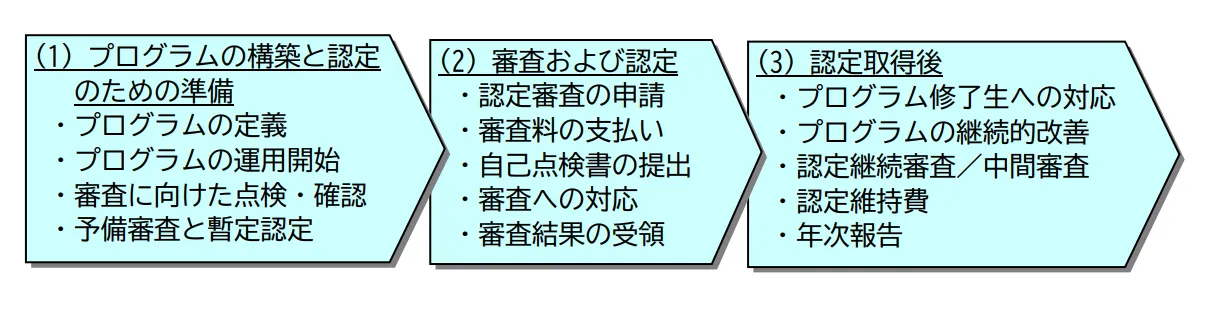 認定の取得を計画されているプログラム関係者の方は、審査を受けるまでに以下の手順で準備されることをお勧めします。